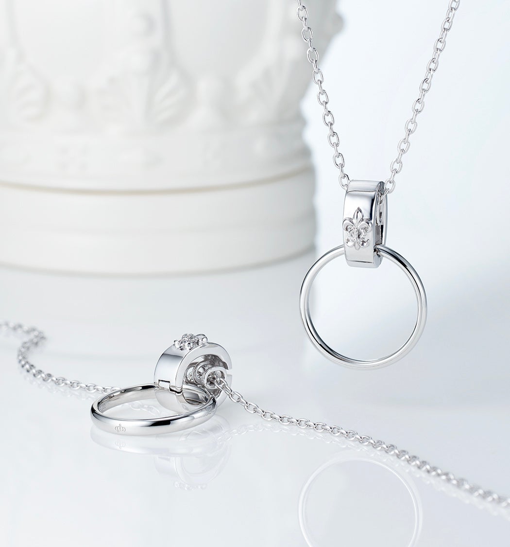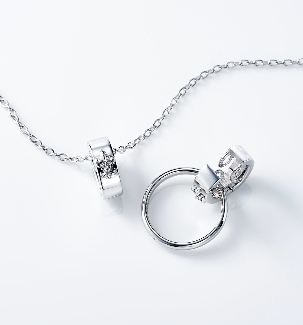 ふたりの結婚指輪をペンダントに対象のエンゲージメントリング、マリッジリングをペアでご成約のお客さまへ幸せの象徴であるリリーモチーフを施した“ラブホルダーネックレス”をペアでプレゼントいたします。